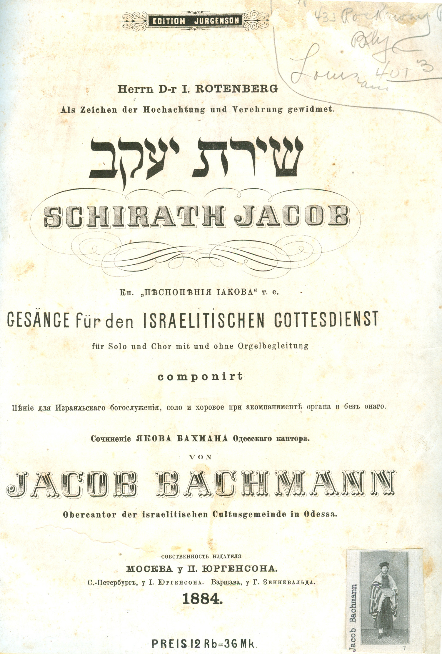 Jacob Bachmann was born in 1846 in Berdichev (today Ukraine). As a child he studied in a Yeshiva. He began his music studies in Moshe Pasternak’s choir at the local synagogue. When he was eighteen, Bachmann went to study at the St. Petersburg Conservatory under Anton Rubinstein, where he studied voice and musicianship. Bachmann developed a dramatic tenor voice and went on to perform concerts with Rubinstein. Despite these performances with Rubinstein, who was considered the 'westerner of Russian music,'* Bachmann choose a career in cantorate. He began his career with short-term offices in Berdichev, Rostov and Constantinople, and later established his reputation in Lemberg (1868-1864), Odessa (1884-1885) and Budapest (1885-1905), where he finally settled.