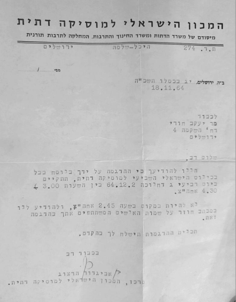 The Yaakov Huri's recordings project was carried out within the grant “From Berlin to Jerusalem and Back - The Letters of German-Jewish Musicologist Edith Gerson Kiwi (1908-1992),” a joint venture of the Europäisches Zentrum für Jüdische Musik (Hochschule für Musik, Theater und Medien Hannover, Germany) and the Jewish Music Research Centre (Hebrew University of Jerusalem, Israel) in the framework of the Research Cooperation Agreement Lower Saxony – Israel (Aktenzeichen: A125614) of 2016-2020.